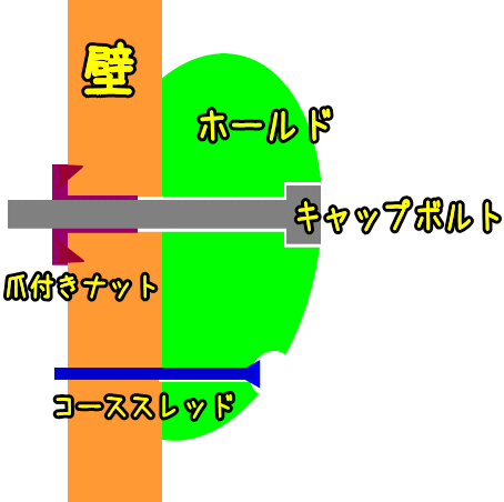 壁裏に設置した爪つきナットに、ボルトでホールドを固定し