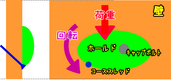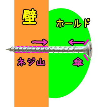 ビスは「傘と壁に入ったネジ山」で、ホールドをは締め付けて固定しますので